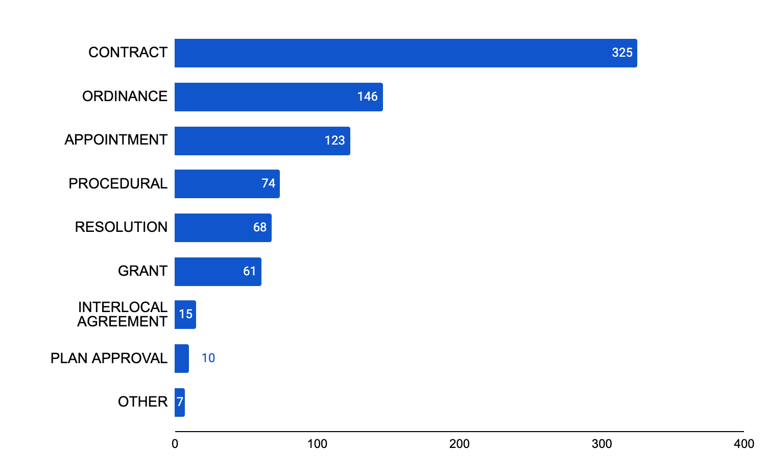 Ordinances tied to zoning and annexation accounted for the majority of both split votes and failed votes, despite ordinances comprising just 18% of the council’s overall agenda. These votes often followed public hearings, drawing intense community scrutiny and media attention. Of the nine failed votes, six were ordinances. Five were ordinances related to rezonings and annexations - the other failed ordinance was a unanimous vote against revising a 2013 law to allow bow hunting of deer on properties of less than two acres.