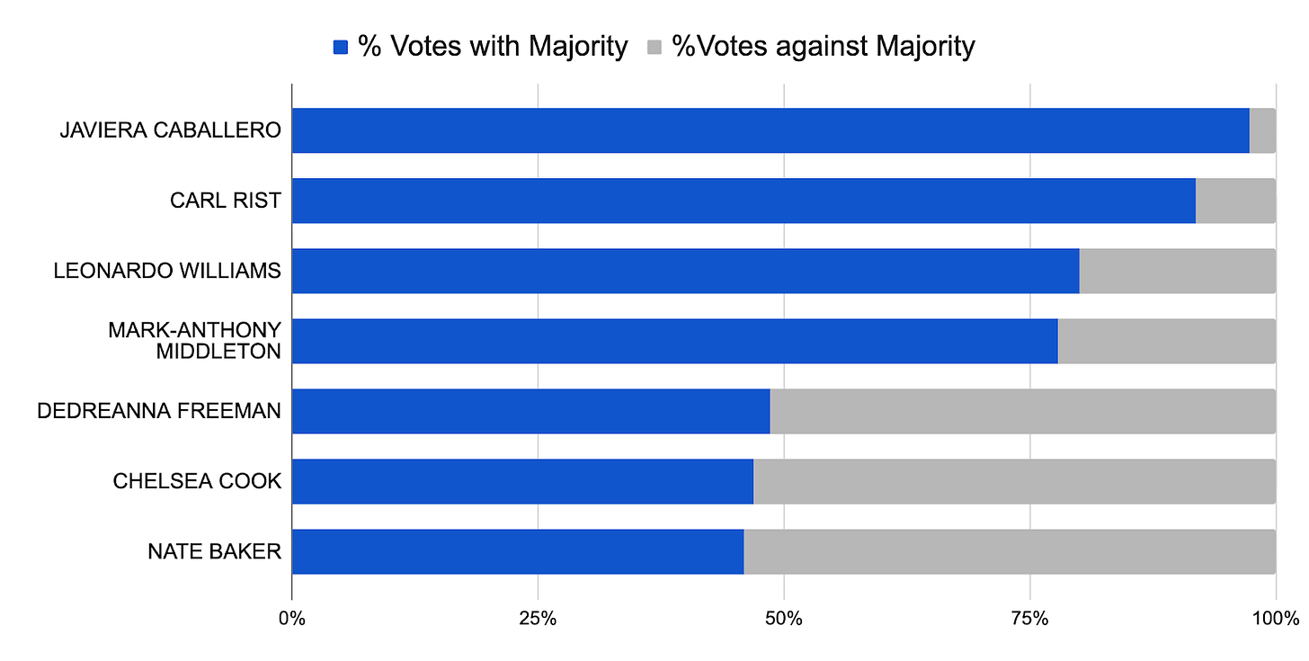 These findings offer a lens into the council’s decision making over the past two years. Between December 2023 and July 2025, the council cast approximately 829 votes. An overwhelming 98.9% of those votes passed, and 96% of passing items were done so unanimously—suggesting broad agreement. But the 37 split votes, including seven that failed, expose ideological fault lines that could shape the outcome of this year’s election.